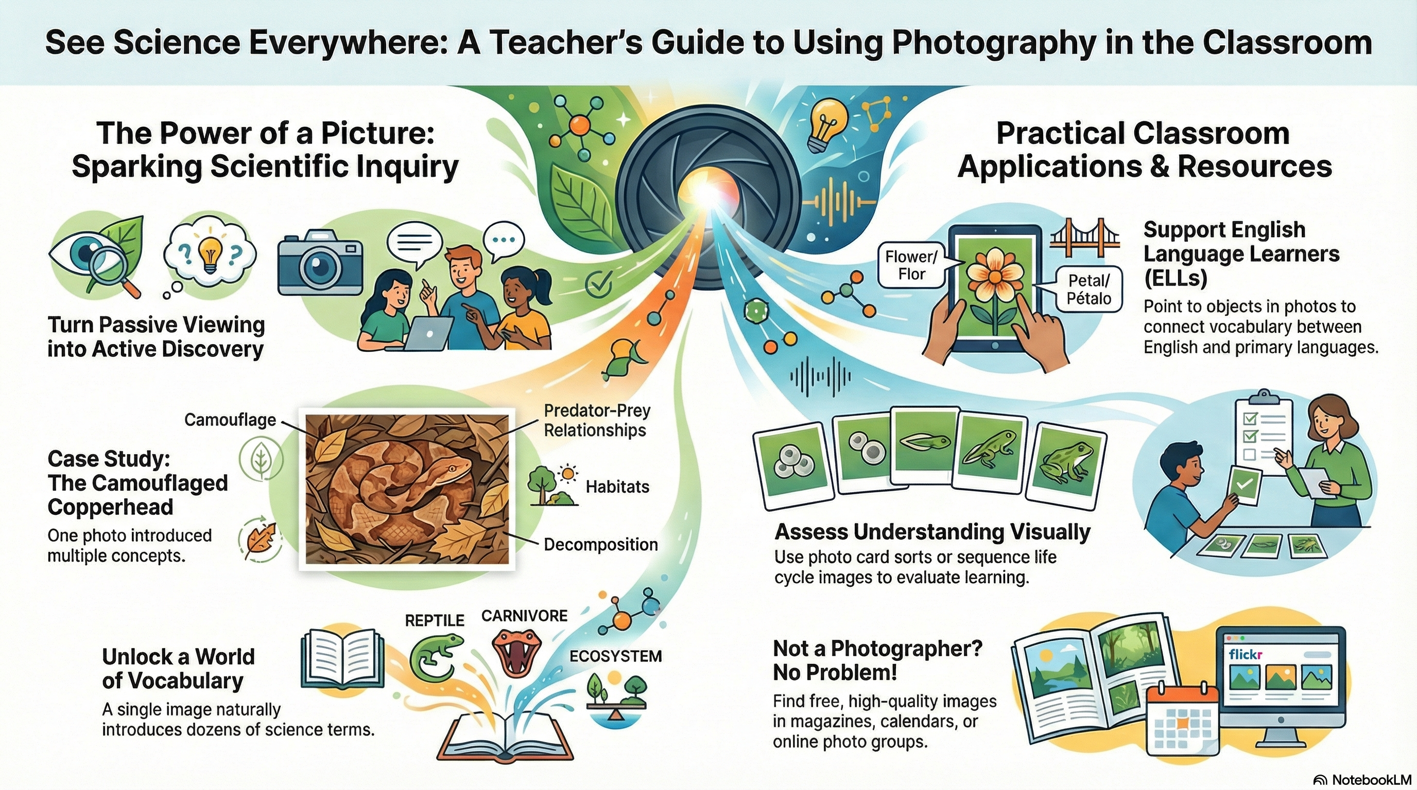 Photography and visual media transform abstract science concepts into tangible, accessible learning experiences that connect classroom content to students' lived experiences.